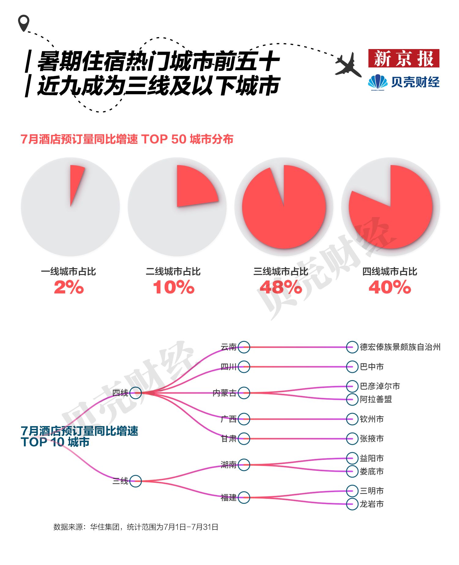 在中小学放暑假的背景下,亲子游、研学游、避暑游等特色旅游成为暑期游主流。而随着国内旅游市场的发展,游客已经不满足于“扎堆旅游”等传统观光方式,渴望获得更加丰富多元的体验,探索独特、冷门、有地域文化特色的小城及县域已成为今年以来的旅游大趋势。根据华住集团的数据,今年7月预订量增速排名前50的城市中,88%属于三线及以下城市,其中三线城市占比48%。