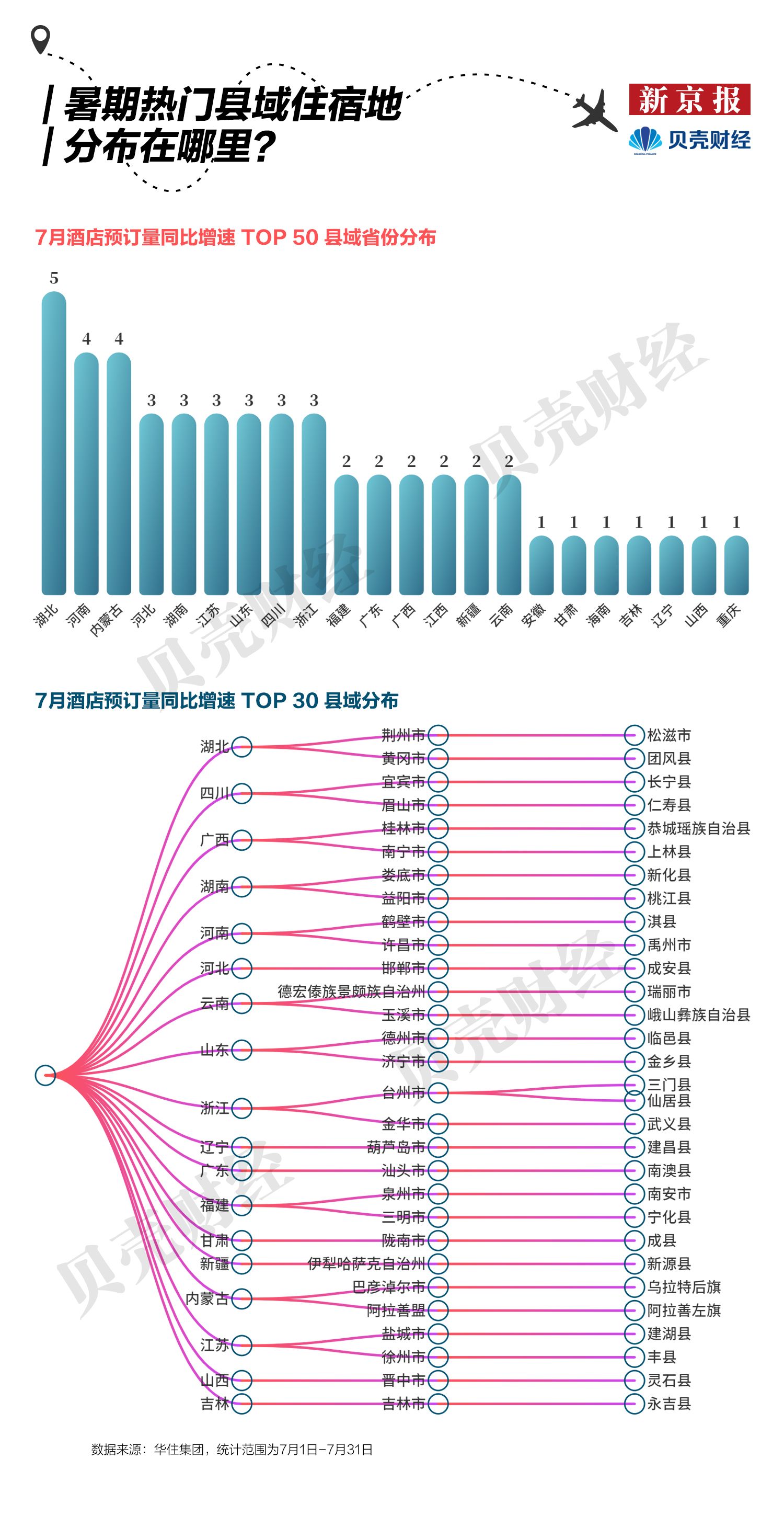 根据华住集团的数据,今年7月,全国酒店预订同比增速前50的县城及县级市共覆盖全国22个省份,其对应城市与同比增速前50的城市重合度为零,表明县域地区的酒店预订增速相对独立。