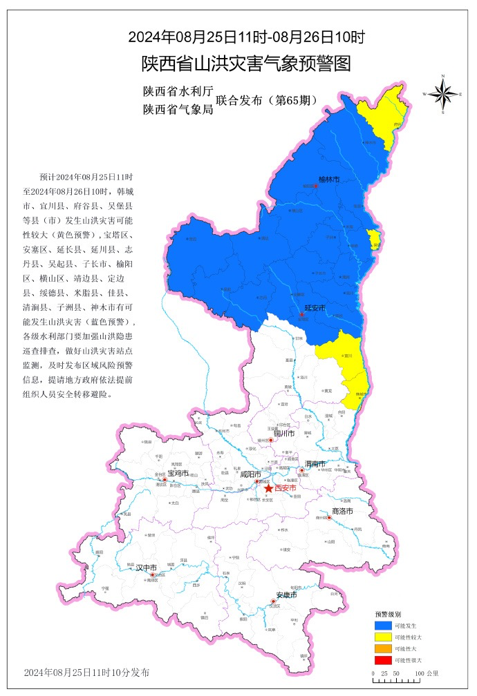 预计2024年8月25日11时至2024年8月26日10时,韩城市、宜川县、府谷县、吴堡县等县(市)发生山洪灾害可能性较大(黄色预警),宝塔区、安塞区、延长县、延川县、志丹县、吴起县、子长市、榆阳区、横山区、靖边县、定边县、绥德县、米脂县、佳县、清涧县、子洲县、神木市有可能发生山洪灾害(蓝色预警),各级水利部门要加强山洪隐患巡查排查,做好山洪灾害站点监测,及时发布区域风险预警信息,提请地方政府依法提前组织人员安全转移避险。