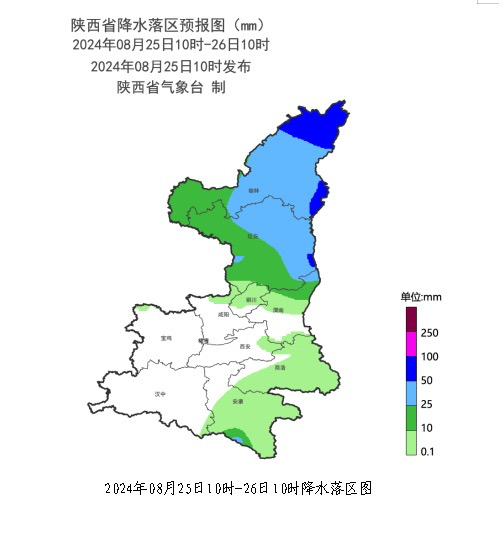 受副热带高压和低涡切变共同影响,预计8月25日10时至26日10时(未来24小时),陕北北部及东部部分地方有大雨(25~50毫米)。其中榆林(神木市、府谷、佳县、绥德、吴堡、清涧)、延安(宜川)有暴雨(50~70毫米)。降水期间部分地方伴有短时暴雨(最大小时雨量20~40毫米,局地可达50毫米以上)、雷暴大风等强对流天气。由于降水对流性强,落区有一定不确定性,上述相邻县区也需高度关注。中小河流洪水:预计未来24小时我省孤山川河、窟野河、秃尾河、无定河等黄河河流及其子流域面雨量30~50毫米 。上述地区达到中小河流洪水蓝色风险可能性大。