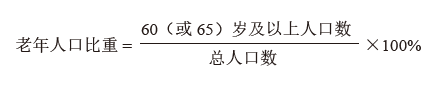 国际上通常用老年人口比重作为衡量人口老龄化的标准,老年人口比重越高人口老龄化程度也越高。一般把 60 岁及以上的人口占总人口比重达到 10%,或65 岁及以上的人口占总人口的比重达到 7% 作为一个国家或地区进入老龄化社会(或老年型人口)的标准。