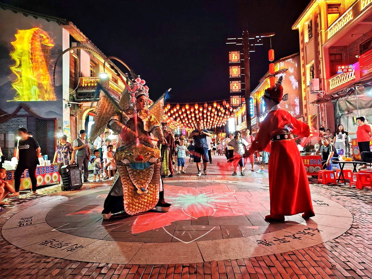 盛夏,夜幕降临,福建永春县的五里古街灯火通明,当地市民和游客陆续到来,这条全长约590米的传统街区逐渐热闹了起来。