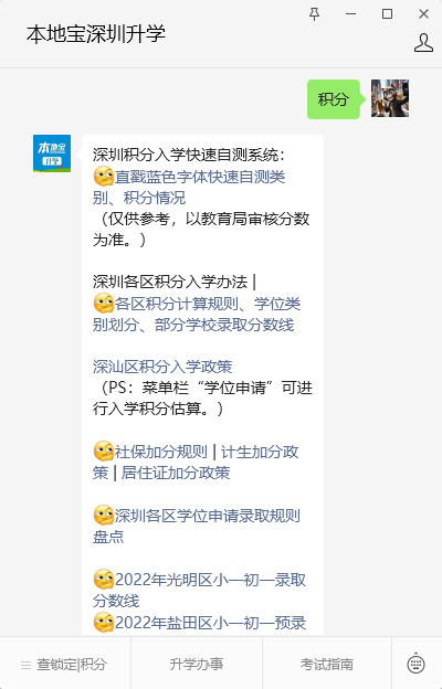 温馨提示:微信关注公众号【本地宝深圳升学】回复【积分】可获深圳十区积分规则(户口+居住+社保)、积分自测入口、往年录取分数线参考等最新消息