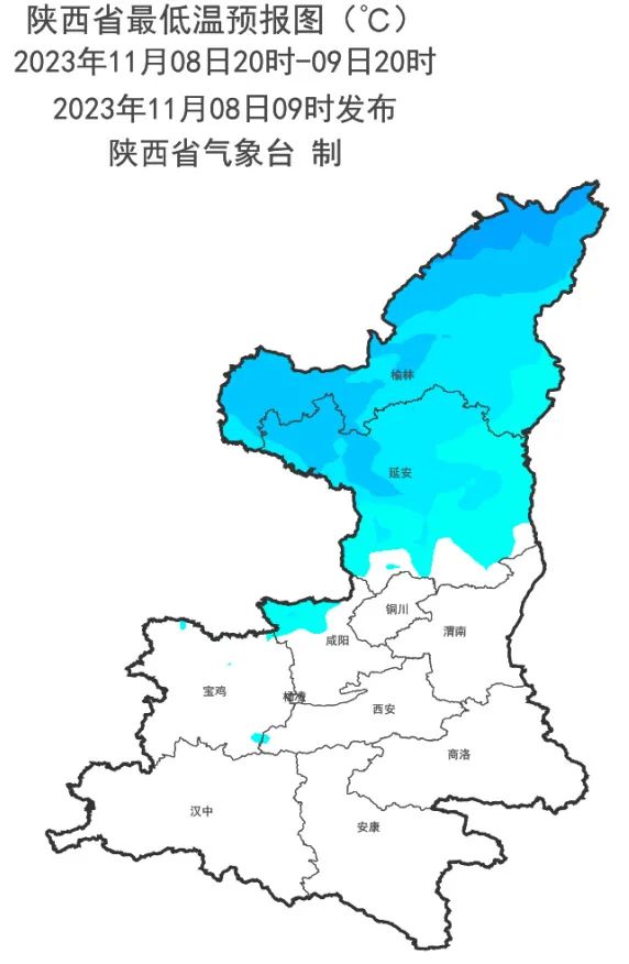 受冷空气影响,预计8日夜间至9日清晨,咸阳北部局地、延安大部、榆林、秦岭山区局地地面最低气温将降至0℃以下,其中延安西部、榆林大部降至-3℃以下,上述地区将出现对当季主要作物产生明显影响的霜冻天气,请注意防范。