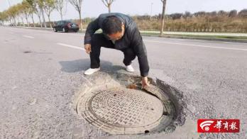 ▲11月13日下午6时许,75岁的西安市民杨先生骑电动车回家,经过桑军大道时不慎被路中间的一个凹陷的井盖绊倒,导致鼻子、嘴唇受伤,缝了十多针。老人受伤后立即被送至西安市高陵区医院,目前还在住院治疗。记者在现场看到,桑军大道从南向北方向机动车道上有一个井盖出现凹陷,深约20厘米,井盖上写着西安经开给水,井盖周围无任何警示标示,多辆电动车行至附近才发现有“坑”,杨先生的侄子搬来砖块等摆起了警示标志,希望路人绕行。西安市经开区城市管理局泾渭大队工作人员称,会尽快去现场查看并进行修复,同时将对接老人家属。