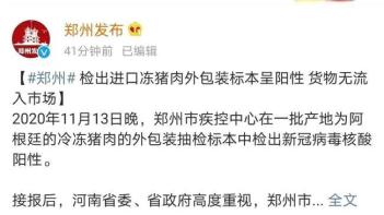 ▲13日,河南郑州市疾控中心在一批产地为阿根廷的冷冻猪肉外包装抽检标本中,检出新冠病毒核酸阳性。因及时检测和封存,该批货物没有流入市场。