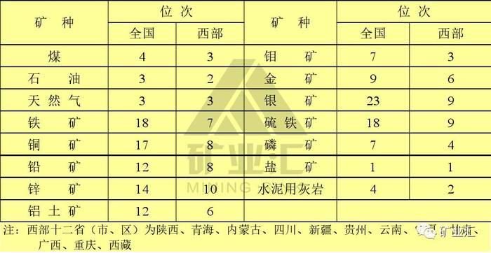 陕西省15种重要矿产资源在全国及西部储量排名