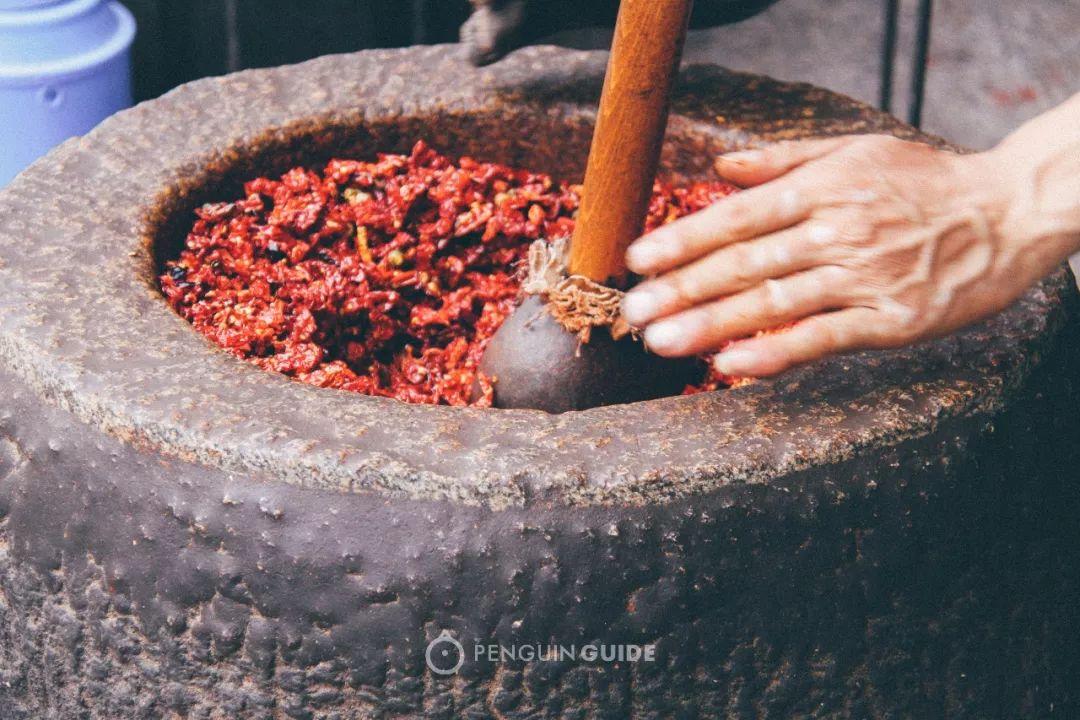 焙干后的辣椒变得酥脆,铁锤拓后更能释放香气。一根铁锤大概有二十多斤,拓辣椒是纯力气活,一个师傅一天最多拓出四十斤辣椒面。