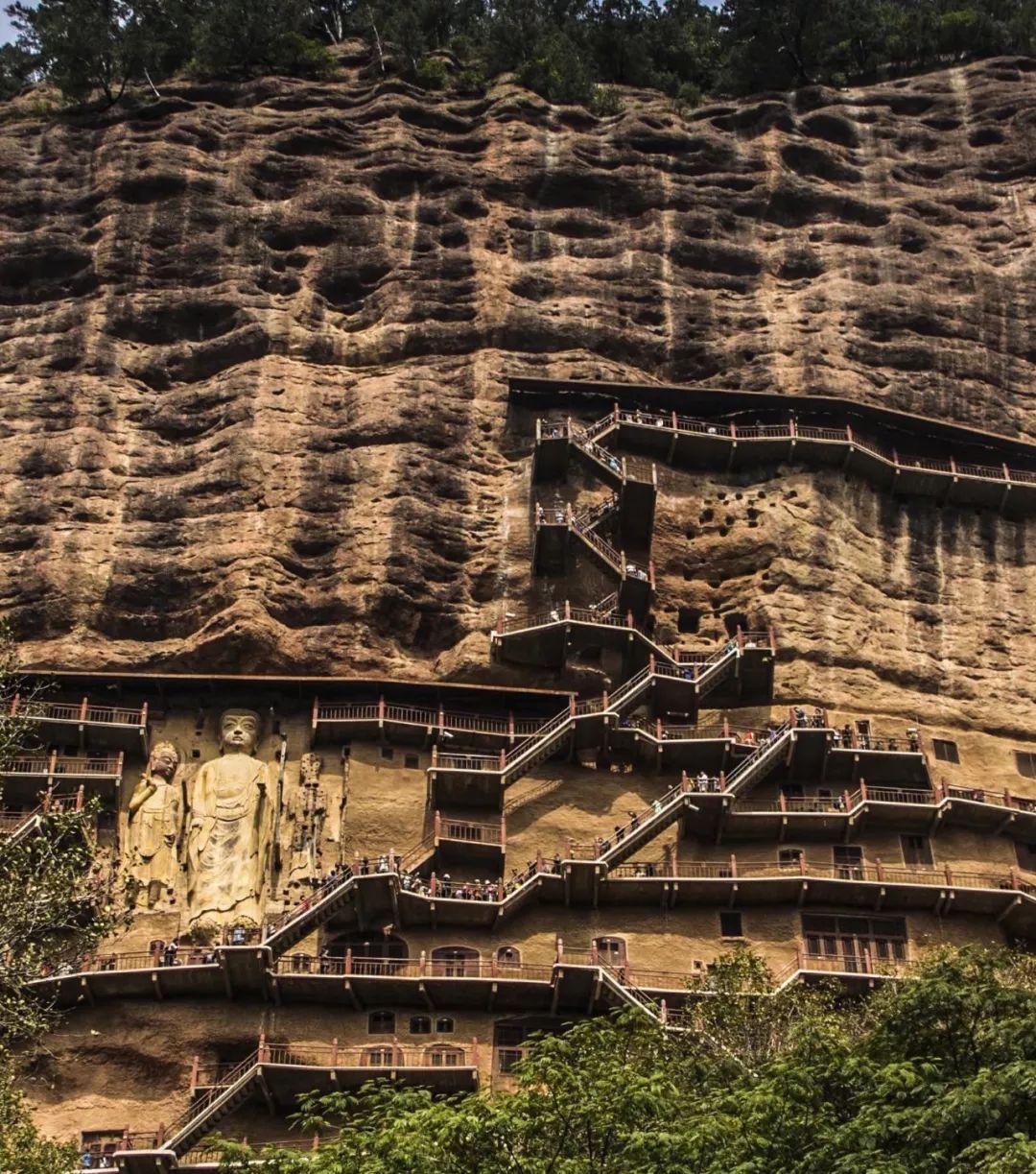 2. 非常推荐去麦积山!90度峭壁上挂着的石窟栈道,视觉上就非常震撼,顺着栈道你可以看到历代佛像的造型表情的生动变化。附近有仙人崖和曲溪,既能感受西北江南的柔美,又有北方山脉的雄浑气魄。