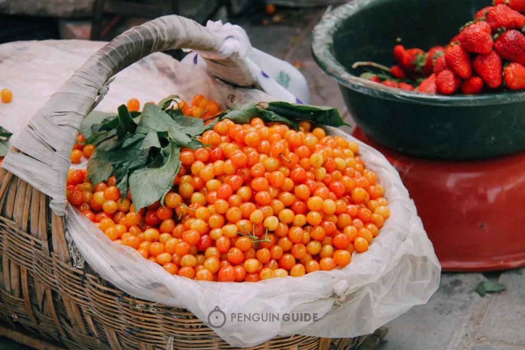 这篮子土樱桃还挂着露水,酸酸甜甜,解腻解辣都很配:
