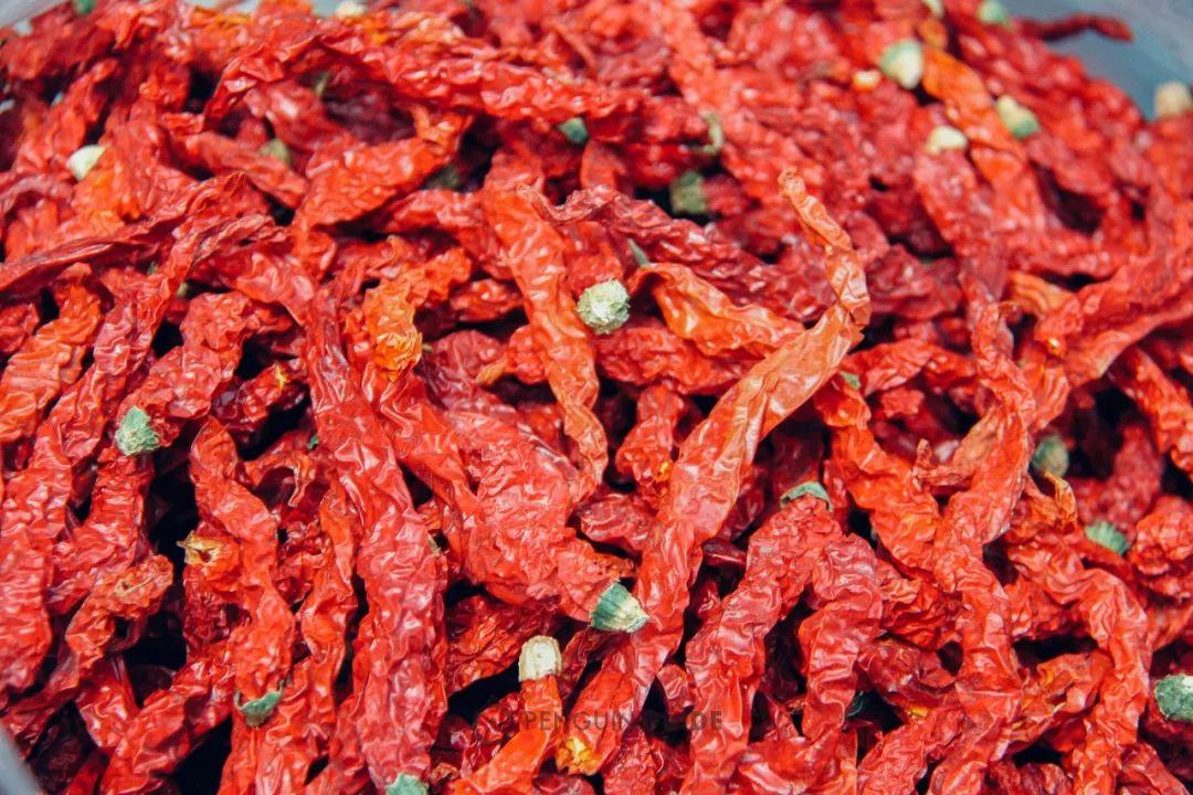 选色泽红亮的新鲜辣椒,肉厚饱满。去掉辣椒把儿,剪成环状,烘干后用油焙干。油焙辣椒真的很迷人了,高温激发出辣椒香气,让整条街都弥漫着香气。