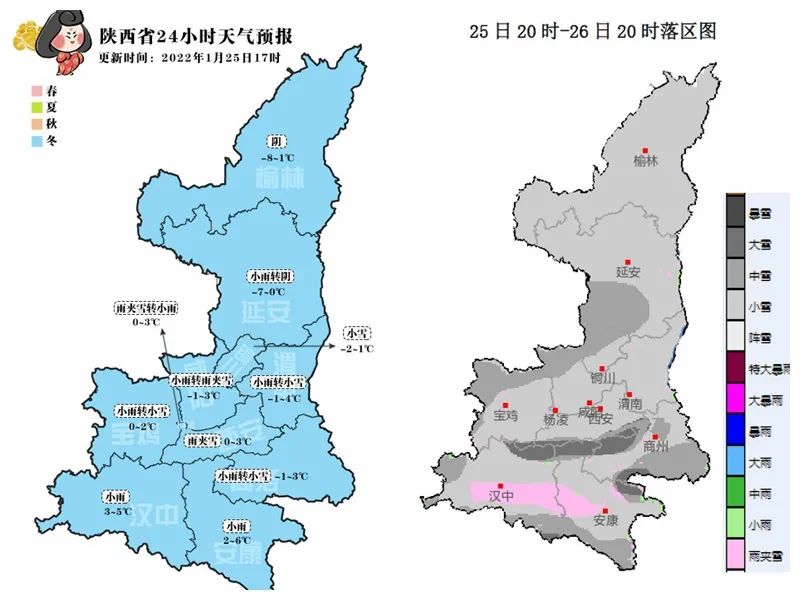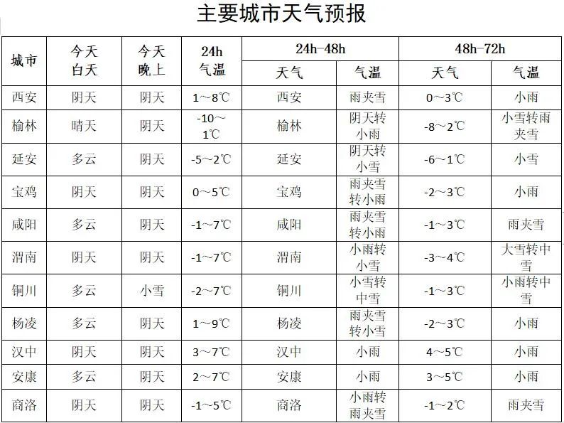 今天晚上 全省阴天,陕北西部及南部、关中、陕南大部有小到中雪。