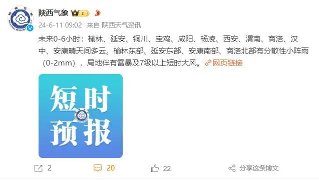今天上午9点多,陕西气象发布短时预报,这些地方有分散性小阵雨,局地伴有雷暴及7级以上短时大风。