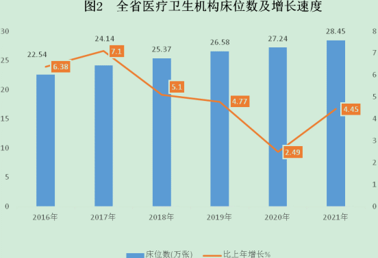 (二)床位数。2021年末,全省医疗卫生机构床位28.45万张,其中:医院23.36万张(占82.08%),基层医疗卫生机构4.09万张(占14.38%),专业公共卫生机构0.97万张(占3.39%)。医院中,公立医院床位占70.35%,民营医院床位占29.65%。与上年比较,床位增加1.21万张,其中:医院床位增加1.43万张(公立医院增加0.77万张,民营医院增加0.66万张),基层医疗卫生机构床位增加0.1万张,专业公共卫生机构床位减少0.28万张。每千人口医疗卫生机构床位数由2020年6.89张增加到2021年7.2张。