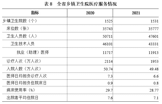 2021年,乡镇卫生院诊疗人次1953万,比上年减少161万人次;入院人次49.48万,比上年减少1.26万人次。2021年,医师日均担负诊疗6.6人次、住院0.8床日,病床使用率28.77%,出院者平均住院日7.1日。与上年相比,乡镇卫生院医师日均担负诊疗人次下降0.7人次,日均担负住院床日减少0.1床日,病床使用率下降0.93个百分点,平均住院日下降0.5日。