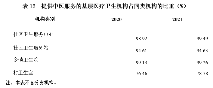 2021年,提供中医服务的社区卫生服务中心占同类机构的99.49%,社区卫生服务站占94.63%,乡镇卫生院占99.26%,村卫生室占78.78%(见表12)。