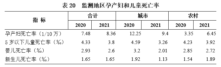 (三)孕产妇死亡率。据全省妇幼健康监测,2021年,全省孕产妇死亡率为8.36/10万,其中:城市9.4/10万,农村6.45/10万(见表20)。全省孕产妇死亡率低于全国平均水平。