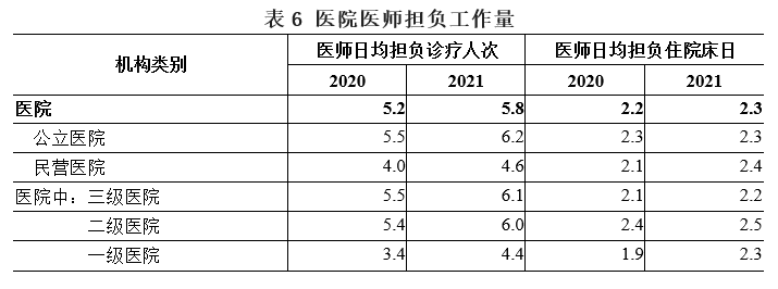 (二)医院医师工作负荷。2021年,医院医师日均担负诊疗5.8人次、住院2.3床日,其中:公立医院医师日均担负诊疗6.2人次、住院2.3床日(见表6)。