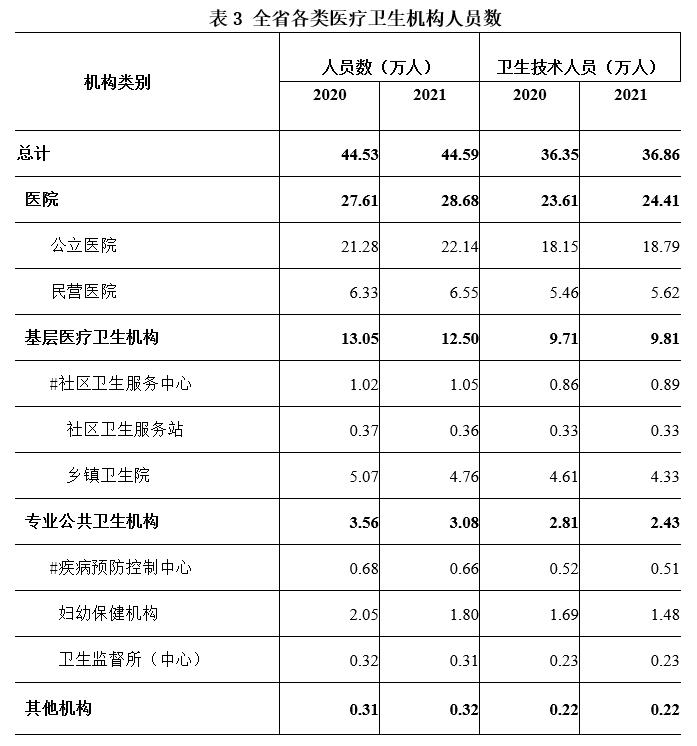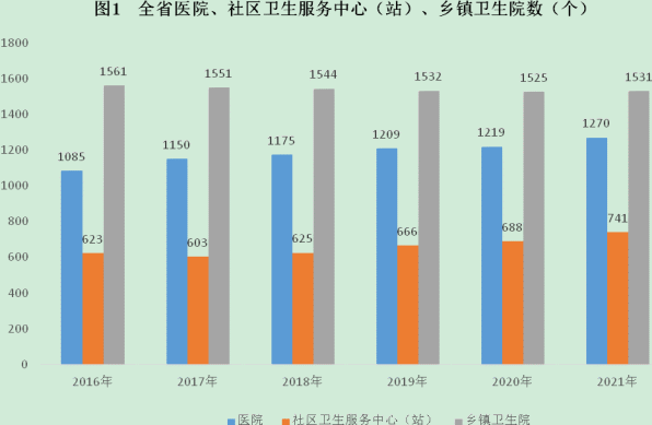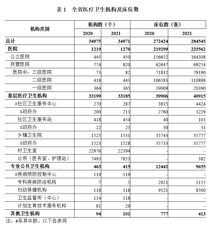 (一)医疗卫生机构总数。2021年末,全省医疗卫生机构总数34971个,比上年减少4个。其中:医院1270个,基层医疗卫生机构33185个,专业公共卫生机构415个。与上年相比,医院增加51个,基层医疗卫生机构减少14个。