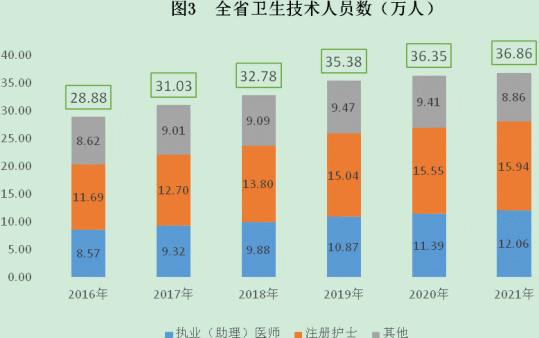 2021年末卫生人员总数中,卫生技术人员36.86万人。卫生技术人员中,执业(助理)医师12.06万人,注册护士15.94万人。与上年比较,卫生技术人员增加5117人(增长1.41%)(见表2)。