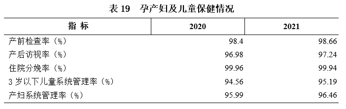 (一)妇幼保健。2021年,孕产妇产前检查率98.66%,产后访视率97.24%。与上年比较,产前检查率、产前筛查率和产后访视率均有提高(见表19)。2021年住院分娩率为99.94%,基本实现全部住院分娩。