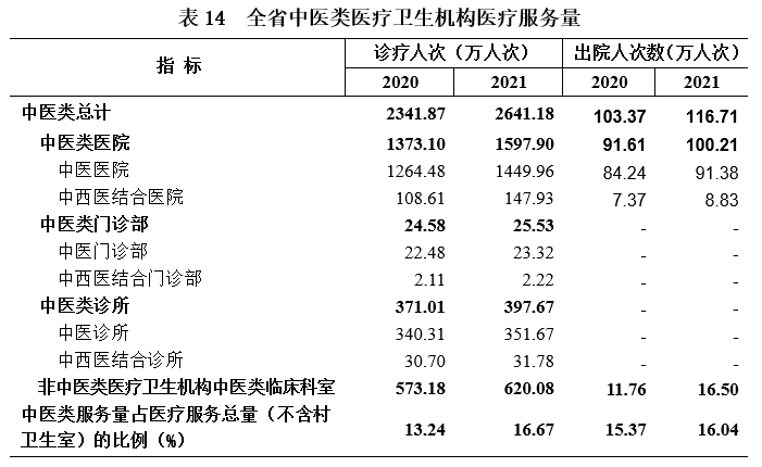 (二)中医医疗服务。2021年,全省中医类医疗卫生机构总诊疗人次2641.18万,比上年增加299.32万人次(增长12.78%)。其中:中医类医院1597.9万人次(占60.5%),中医类门诊部及诊所423.20万人次(占16.02%),非中医类医疗机构中医类临床科室620.08亿人次(占23.48%)。