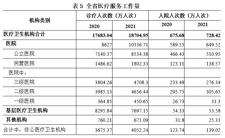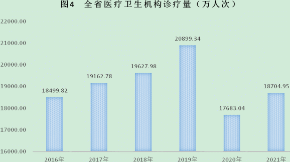 (一)门诊和住院量。2021年,全省医疗卫生机构总诊疗人次18704.95万,比上年增加1021.91万人次(增长5.78%)。2021年居民平均到医疗卫生机构就诊4.73次。