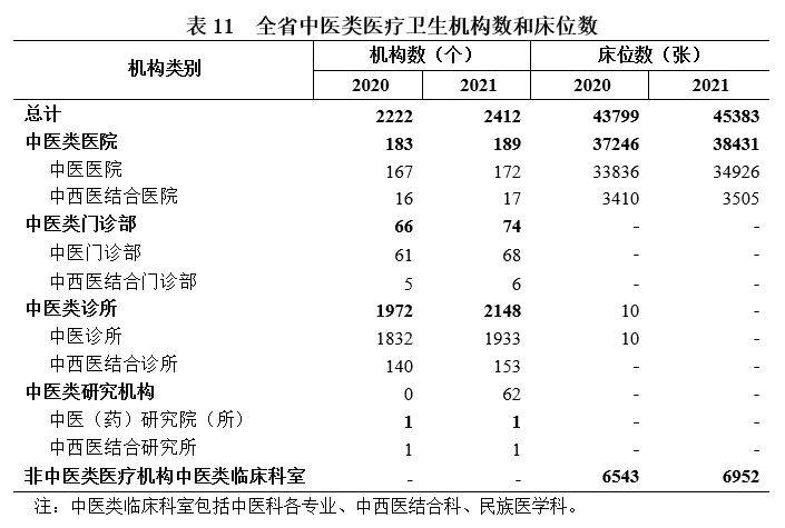 (一)中医类机构、床位及人员数。2021年,全省中医类医疗卫生机构总数2412个,比上年增加190个。其中:中医类医院189个,中医类门诊部、诊所2222个,中医类研究机构1个。与上年比较,中医类医院增加233个,中医类门诊部及诊所增加184个(见表11)。