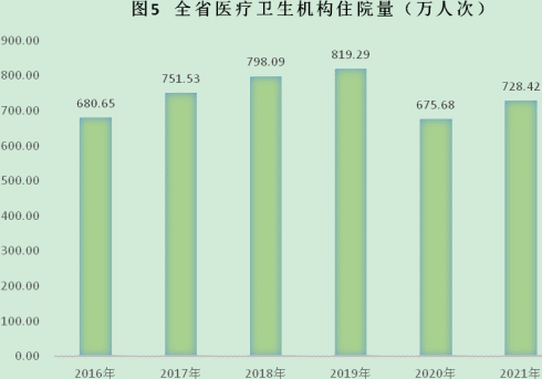 2021年,全省医疗卫生机构入院人次728.42万,比上年增加52.74万人次(增长7.80%),居民年住院率为18.42%。
