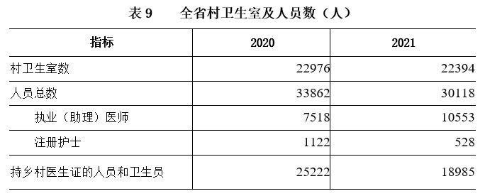 2021年底,全省22394个村卫生室。在村卫生室工作的人员30118人,其中:执业(助理)医师10553人、注册护士528人、持乡村医生证的人员和卫生员18985人。与上年比较,村卫生室数减少582个,执业(助理)医师增加3035人。(见表9)