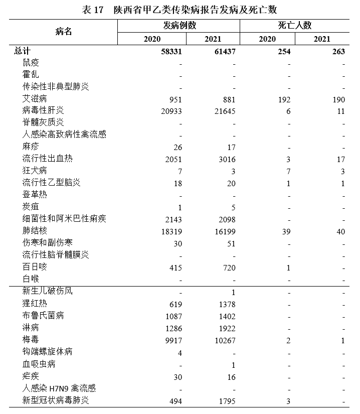 (二)传染病报告发病和死亡。2021年,陕西省甲、乙类传染病报告发病61437例,报告死亡263人。报告发病数居前5位的是病毒性肝炎、肺结核、梅毒、流行性出血热和细菌性和阿米巴性痢疾,占甲乙类传染病报告发病总数的86.6%。报告死亡数居前五位的是艾滋病、肺结核、流行性出血热、病毒性肝炎和狂犬病,占甲乙类传染病报告死亡总数的99.2%(见表17)。