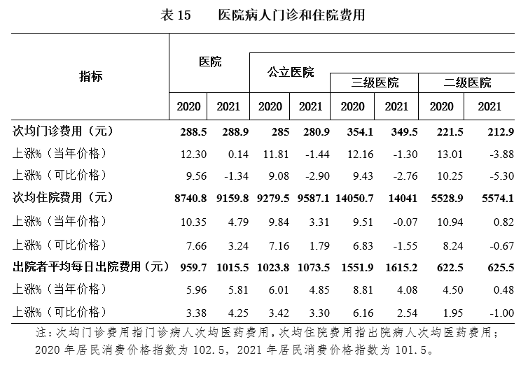 (一)医院病人医药费用。2021年,医院次均门诊费用288.9元,按当年价格比上年上涨0.14%,按可比价格下降1.34%;次均住院费用9159.8元,按当年价格比上年上涨4.79%,按可比价格上涨3.24%。出院者平均每日出院费用1015.5元(见表15)。