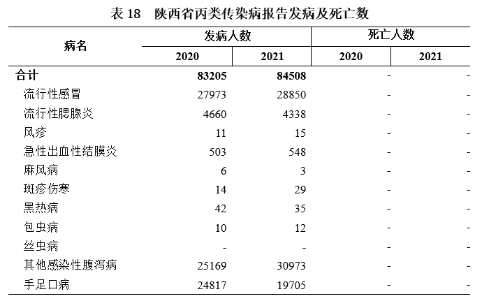 2021年,陕西省丙类传染病共报告发病84508例,无死亡。报告发病数居前5位的病种依次为其他感染性腹泻病、流行性感冒、手足口病、流行性腮腺炎和急性出血性结膜炎,占丙类传染病报告发病总数的99.9%。(见表18)。