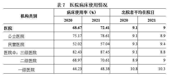 (三)病床使用。2021年,全省医院病床使用率72.41%,其中:公立医院78.61%。与上年比较,医院病床使用率增加3.74个百分点(其中公立医院增加3.44个百分点)。2021年医院出院者平均住院日为9.0日(其中:公立医院8.9日),与上年比较,医院出院者平均住院日减少0.1日(其中公立医院减少0.2日)(见表7)。