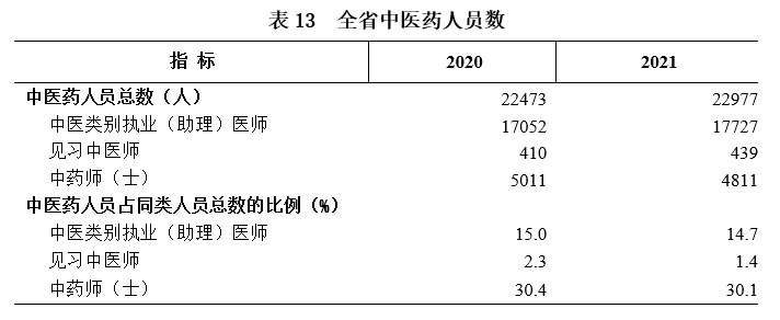 2021年,全省中医药卫生人员总数达2.3万人,比上年增加504人(增长2.24%)。其中:中医类别执业(助理)医师1.77万人,中药师(士)0.48万人。(见表13)。