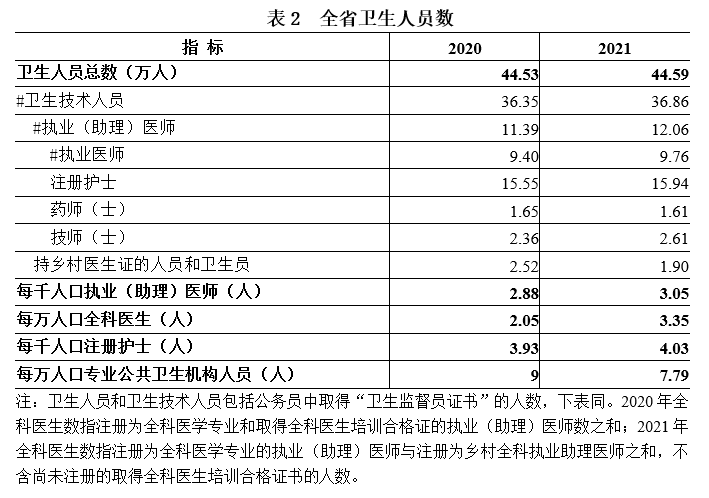 2021年,每千人口执业(助理)医师3.05人,每千人口注册护士4.03人;每万人口全科医生数为3.35人,每万人口专业公共卫生机构人员7.79人(见表3)。