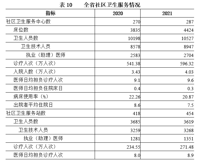 2021年,全省社区卫生服务中心诊疗人次596.32万,入院人次4.03万;平均每个中心年诊疗量2.08万人次,年入院量140人次;医师日均担负诊疗9.6人次、住院0.3床日。2021年,全省社区卫生服务站诊疗人次271.48万人,平均每个站年诊疗量5980人次,医师日均担负诊疗8.9人次(见表10)。