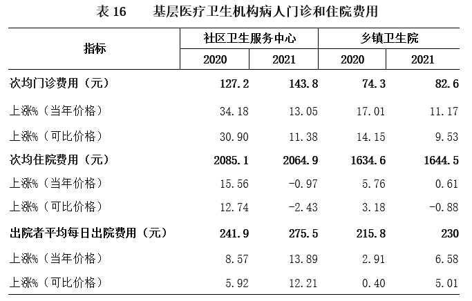 (二)基层医疗卫生机构病人医药费用。2021年,社区卫生服务中心次均门诊费用143.8元,按当年价格比上年上涨13.05%,按可比价格上涨11.38%;次均住院费用2064.9元,按当年价格比上年下降0.97%,按可比价格下降2.43%。(见表16)