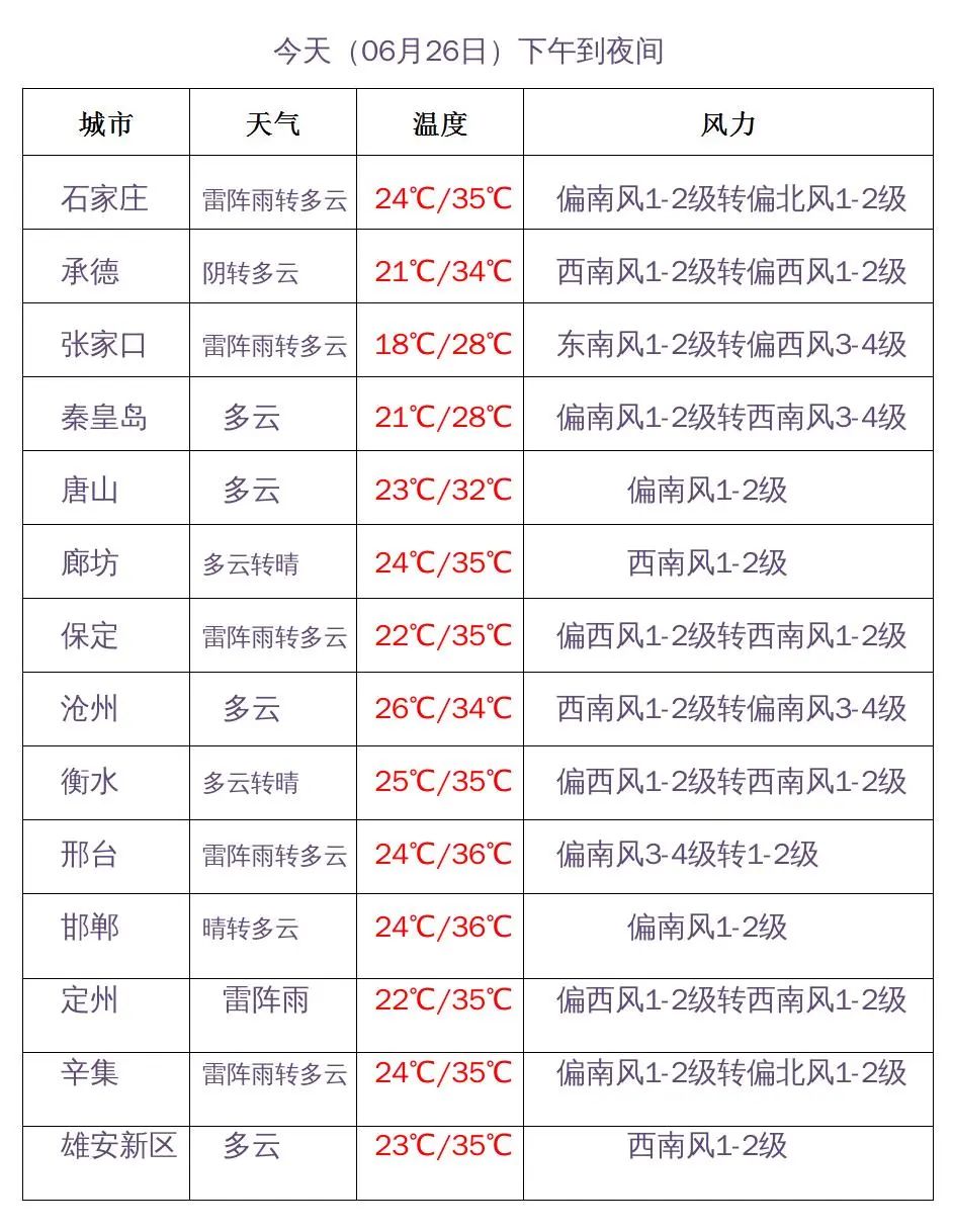 今天下午到夜间,张家口、承德西部、保定、雄安新区、石家庄、沧州西部、衡水西部、邢台、邯郸多云转阴有雷阵雨,雷雨时局地伴有短时大风、短时强降水等强对流天气,个别地点有冰雹,其他地区多云间晴。