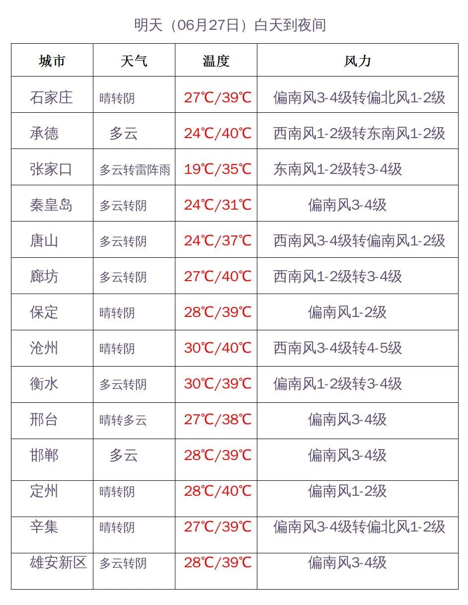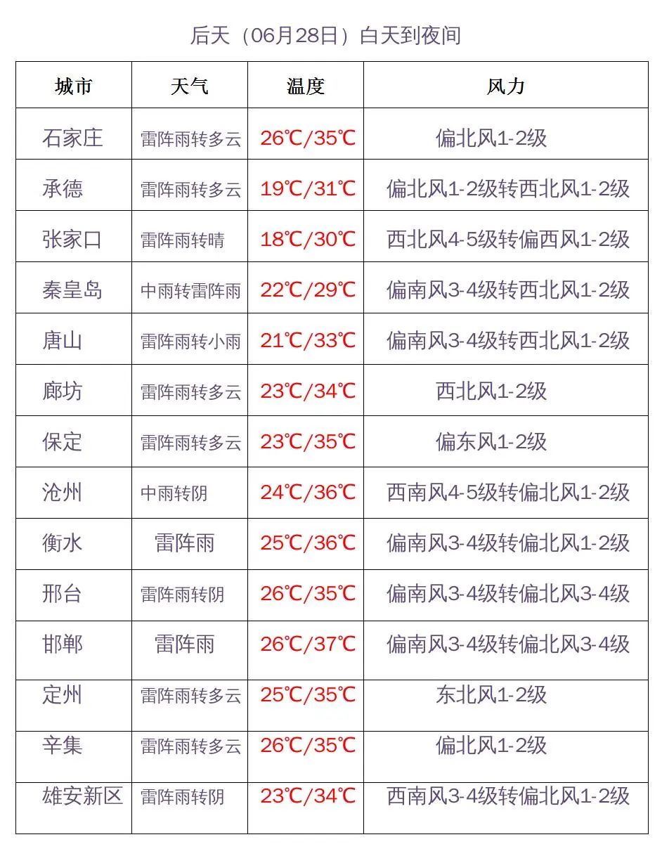 明天夜间到28日,全省多云转阴有雷阵雨,其中承德南部、唐山、秦皇岛、廊坊北部、沧州部分地区有中到大雨,雷雨时局地伴有短时大风、短时强降水等强对流天气。28日白天,沧州、衡水、邢台东部、邯郸东部有偏南风4到5级,阵风6到7级。