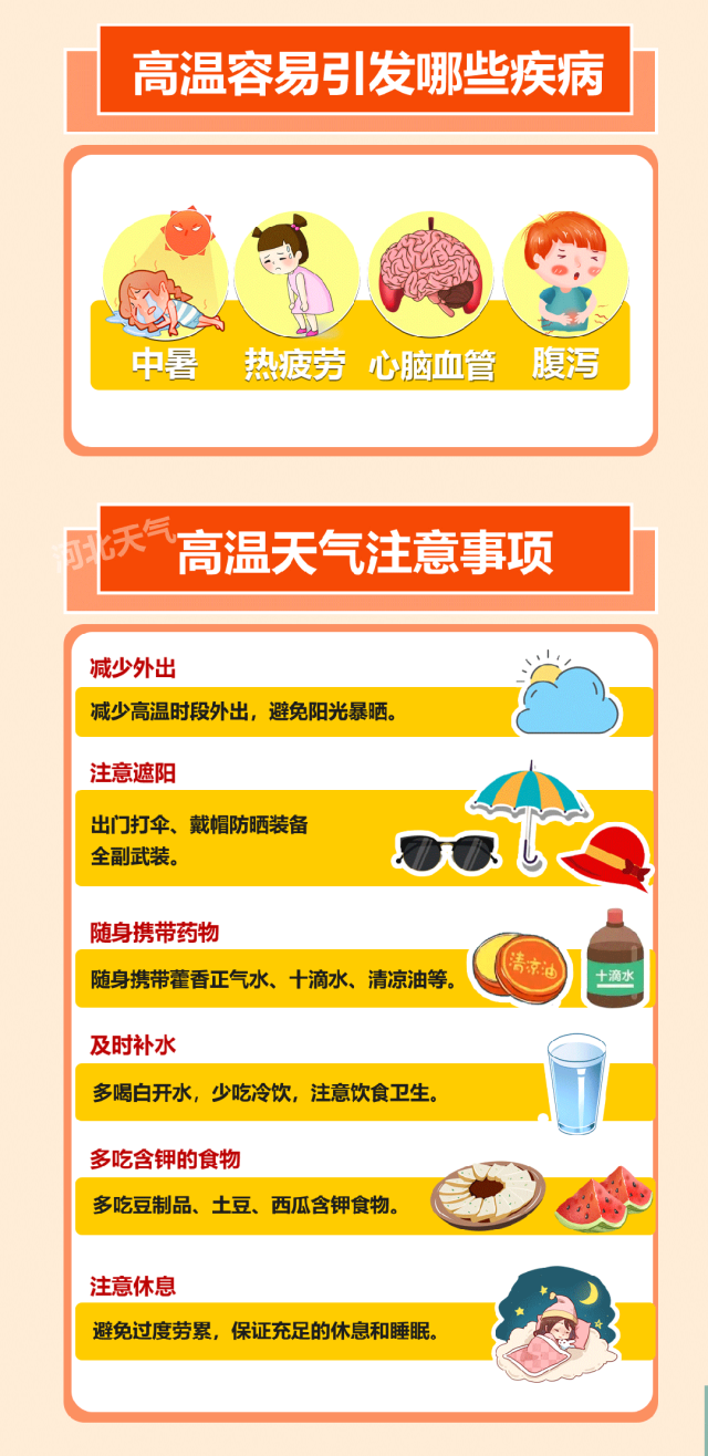 天气“高烧”不退,将增加户外活动发生中暑或热射病风险,小伙伴们一定注意防暑,尽量减少在高温时段外出;户外作业人员做好健康防护。气象专家提醒,北方高温再度来袭,持续时间长、高温强度强,同时,随着副热带高压北抬,江南、华南等地将受到副高控制,气温也较前期明显升高,闷热感加强,公众应注意做好防暑降温的措施,老人、小孩及体质较弱人群应避免高温时段外出,预防中暑或热射病。