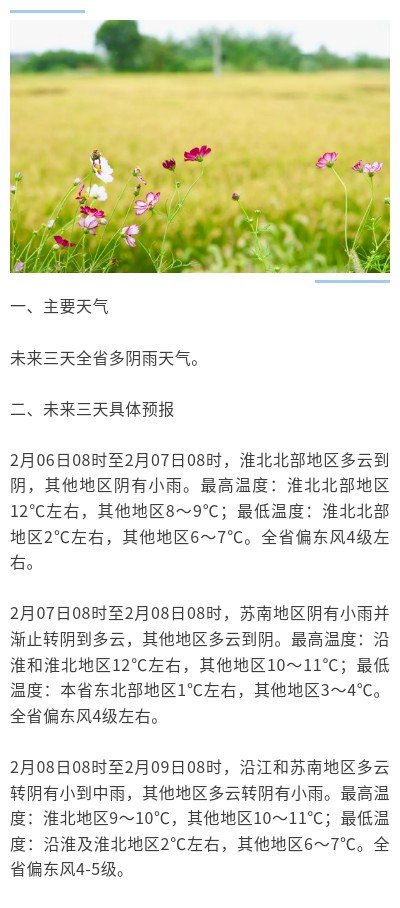 2月06日08时至2月07日08时,淮北北部地区多云到阴,其他地区阴有小雨。最高温度:淮北北部地区12℃左右,其他地区8~9℃;最低温度:淮北北部地区2℃左右,其他地区6~7℃。全省偏东风4级左右。