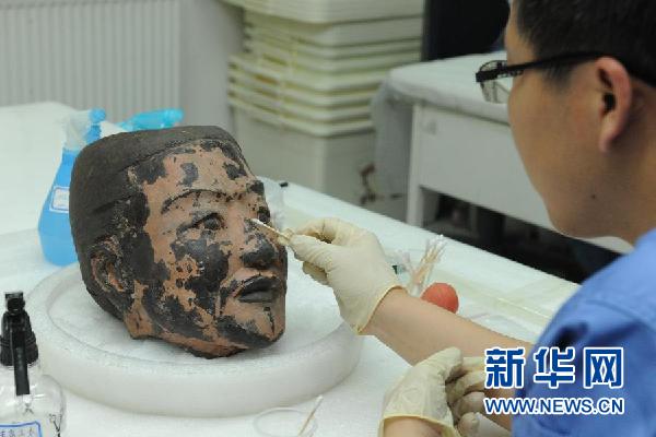 工作人员在西安秦始皇帝陵博物院文物保护实验室内对俑头进行清理(2012年6月9日摄)。新华社发(张天柱 摄)