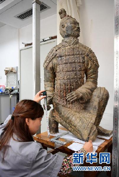 工作人员在西安秦始皇帝陵博物院文物保护实验室内对修复完毕的跪射俑进行测量(9月1日摄)。新华社记者邵瑞摄