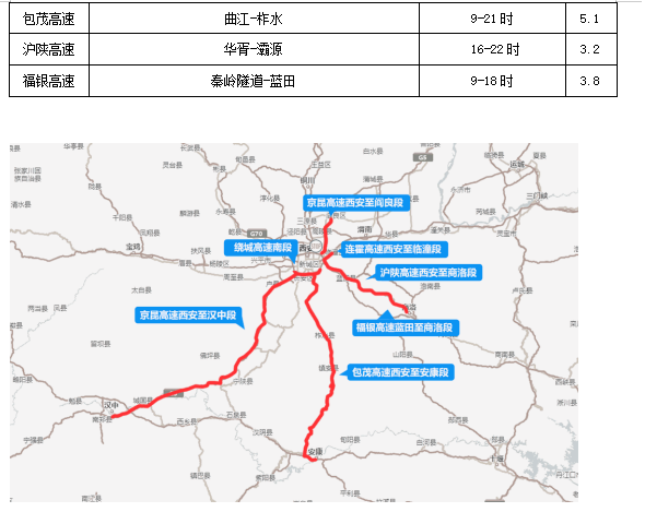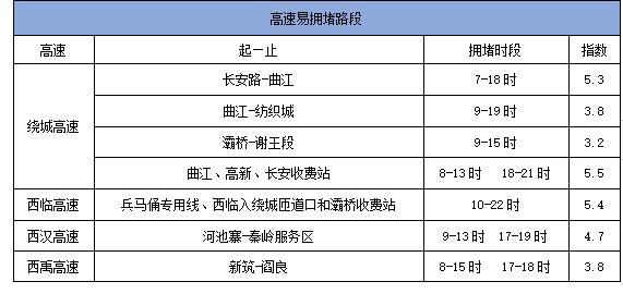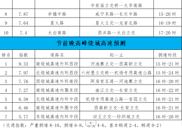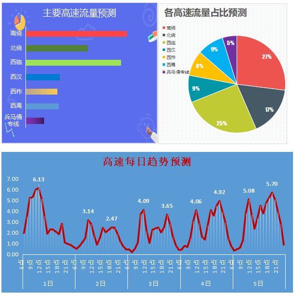 (三)高速流量或将创新高,预计流量将上浮20%-30%。预计1日上午为出行高峰;2-4日将保持大流量;4日、5日返程高峰,曲江、西高新、长安路、纺织城、香王收费站将出现排队等候。预计西临、西汉及绕城高速流量较大,西汉、西柞山区段易发事故,西临每日将出现返程大流量,届时将会实施临时的管制措施。