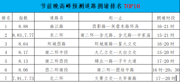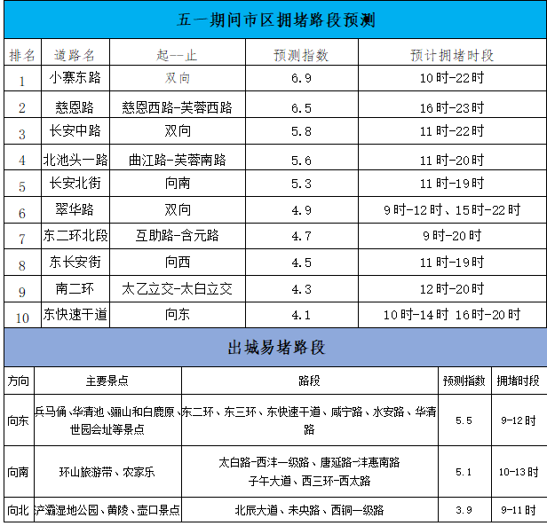 结合往年情况分析,预计4月30日下午16时开始,我市主干道及城市出入口流量将迅速飙升,交通流量的高峰值将较常态周五上升20%左右,加之近期我市地铁施工、城市道路环境提升等施工影响,路网承载力严重下降,事故高发,随时可能出现拥堵蔓延进而引发大面积缓行风险,一、二环,太白南路,绕城沿线、施工路段及城市出入口、前往机场、北客站等主要交通枢纽站的道路流量将上升明显。
