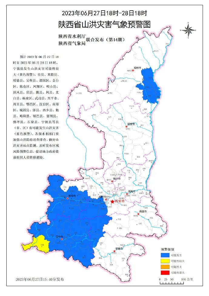 预计2023年06月27日18时至2023年06月28日18时 ,宁强县发生山洪灾害可能性较大(黄色预警),佳县、米脂县、绥德县、吴堡县、渭滨区、金台区、陈仓区、凤翔区、岐山县、扶风县、眉县、陇县、凤县、太白县、杨凌区、武功县、兴平市、周至县、鄠邑区、汉台区、南郑区、城固县、洋县、西乡县、勉县、略阳县、镇巴县、留坝县、佛坪县、石泉县、宁陕县等县(市、区)有可能发生山洪灾害(蓝色预警)。各级水利部门要加强山洪隐患巡查排查,做好山洪灾害站点监测,及时发布区域风险预警信息,提请地方政府提前组织人员转移避险 。