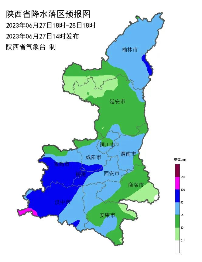 受高空槽和副高外围暖湿气流共同影响,预计6月27日18时至28日18时 ,陕北东北部、关中大部、陕南中西部将出现大雨(25~50毫米),其中榆林东部局地(佳县、吴堡)、宝鸡南部(渭滨区、陈仓区、陇县南部、凤县、太白、眉县、扶风、凤翔南部、岐山)、汉中大部(汉台区、略阳、留坝、勉县、南郑、城固、洋县西部、留坝、佛坪西部、镇巴、宁强)、咸阳南部(武功、兴平、秦都区)、杨凌、西安西北部(周至、鄠邑北部)有暴雨(50~70毫米) ,其中汉中西部局地(宁强南部)有大暴雨(100~120毫米),上述相邻县区也需高度关注。过程期间伴有雷电,局地有短时暴雨、雷暴大风或冰雹 (最大小时雨强20~40毫米,局地可达50毫米)。强降水影响区域易出现山洪、中小河流洪水、滑坡、泥石流、崩塌等地质灾害,请做好应急准备工作,同时需防范城市内涝,关注当地预警信号和短临预报,适时采取应急措施。
