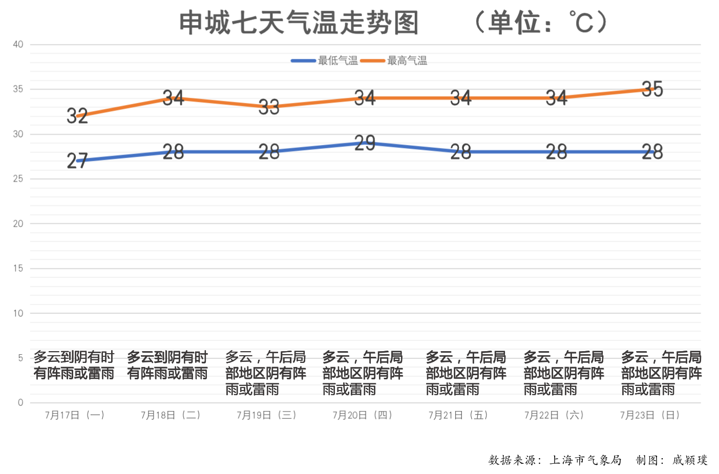 上海中心气象台今天预报,今天(17日)受副热带高压边缘的偏东气流影响,云系较多,有分散性阵雨或雷雨。雨水辅助,高温退场,申城最高温约为32℃,在三伏天里这已经是十分友好的了。时有阵雨或雷雨的节奏还会维持两天,最高气温保持32℃至34℃。周中后期,待副热带高压重新扩张,多云晴热+午后雷阵雨模式重启,上海高温依然少不了。
