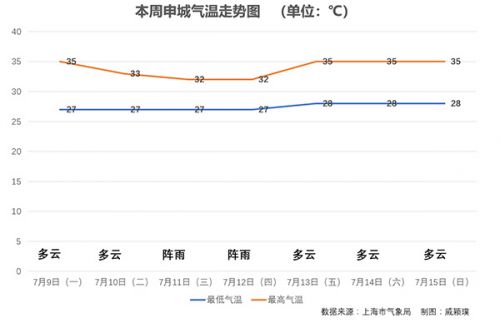 上海中心气象台预报,由于副热带高压强势霸屏,出梅后上海以晴热少雨天气为主。今天,上海最高气温可达35℃。据统计,本周共有四个35℃以上的高温日。